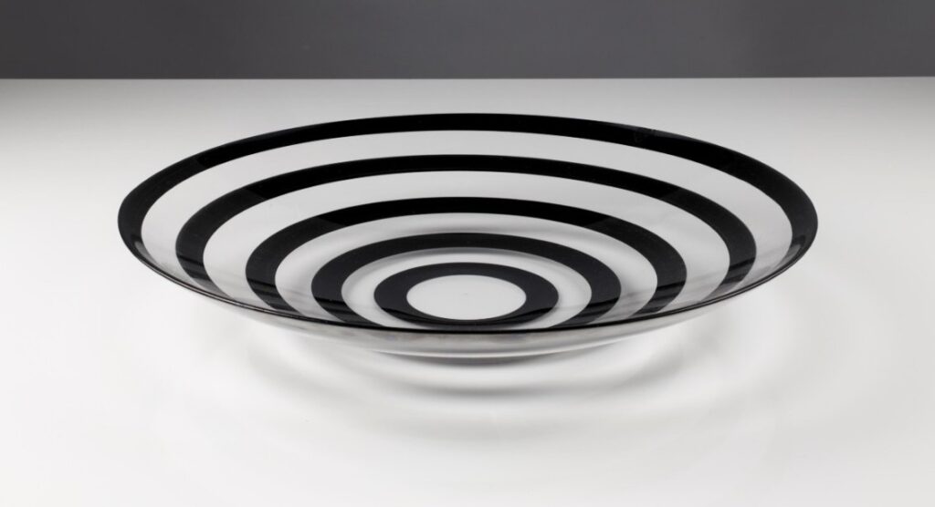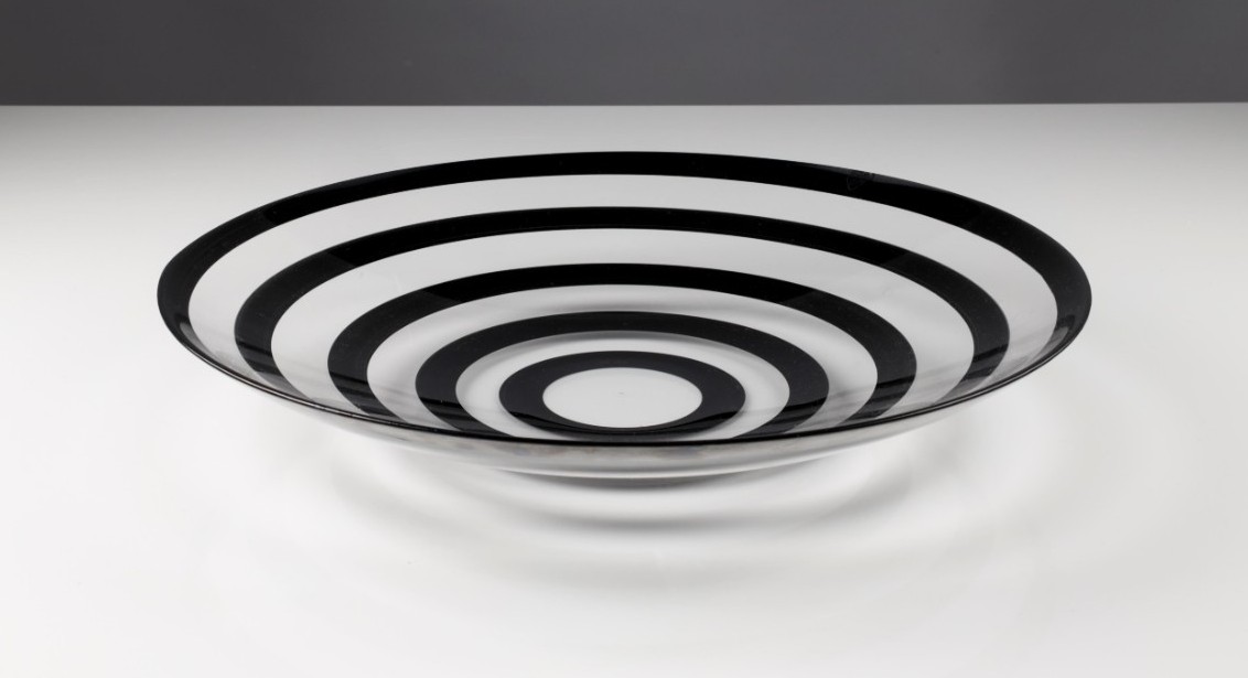 Farbloses Glas, schwarz gemalter Streifendekor, monogrammiert: A N, Klebeetikett: Orrefors Sweden,